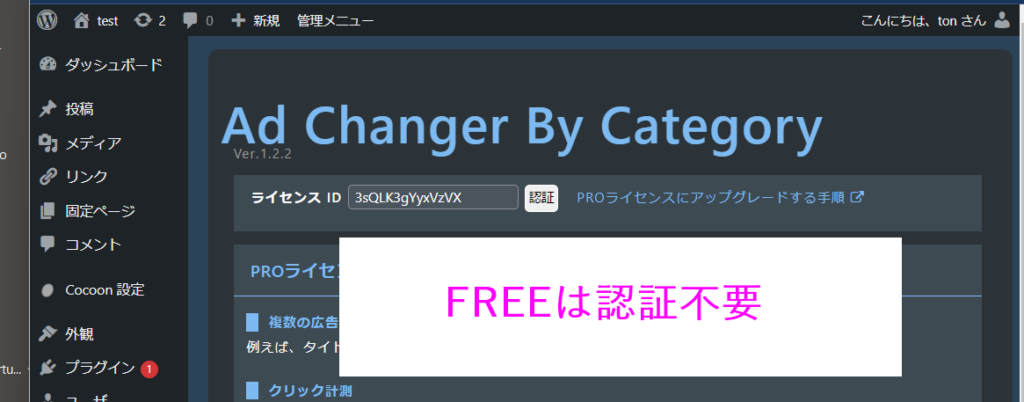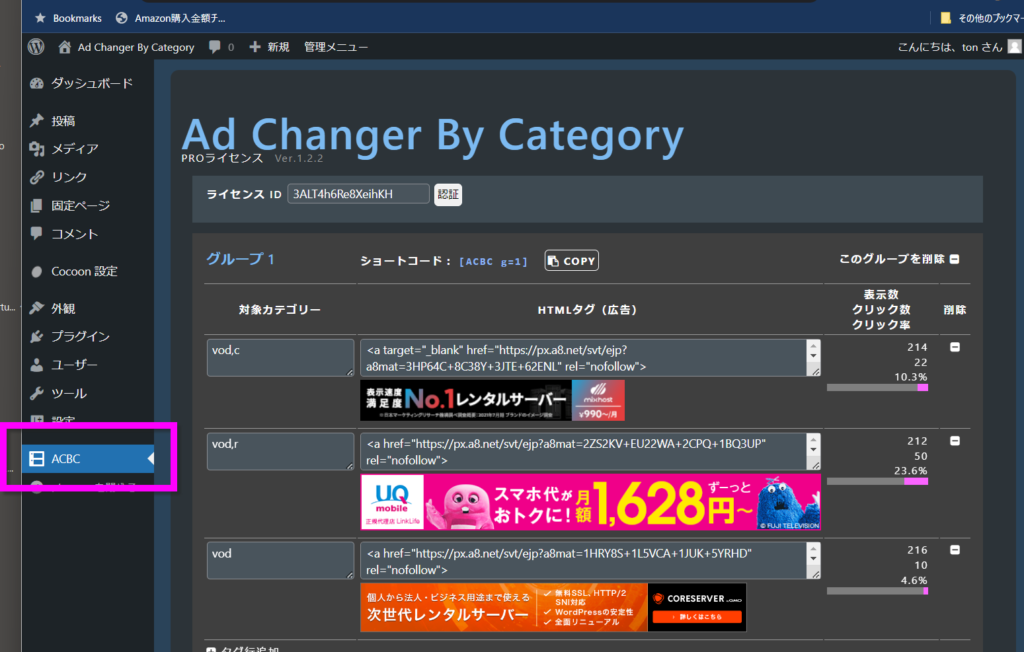 左メニューの「ACBC」がAd Changer By Categoryの管理画面です。