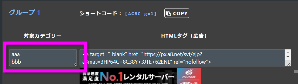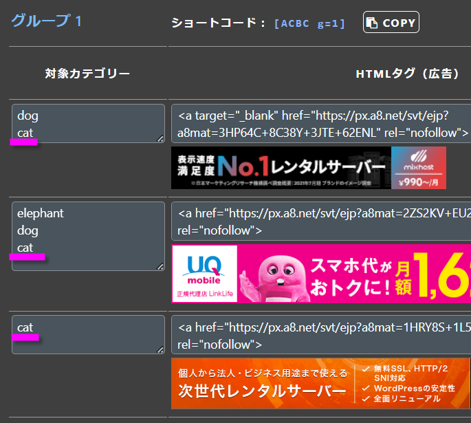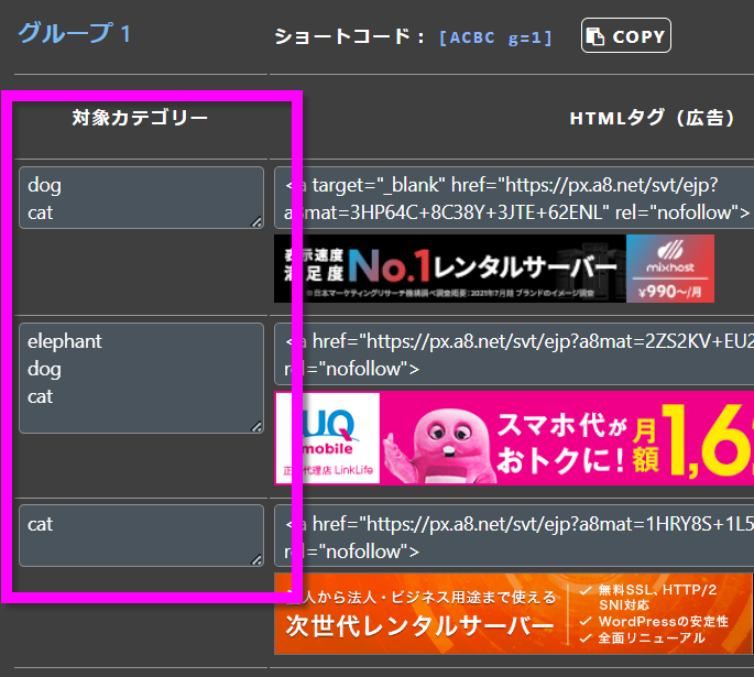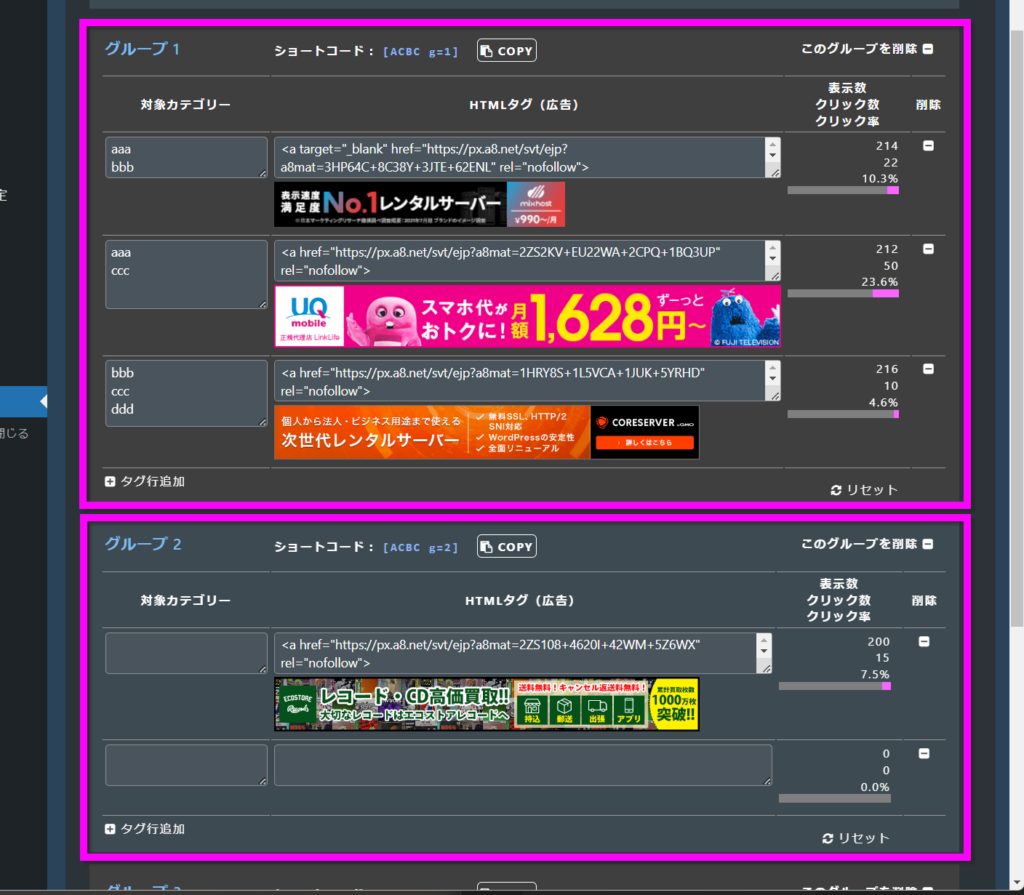同じグループ内で、同じカテゴリーを複数設定すると、いずれかの広告がランダムで表示します。