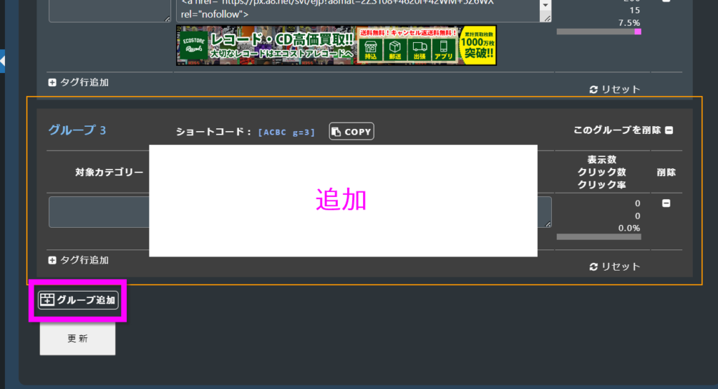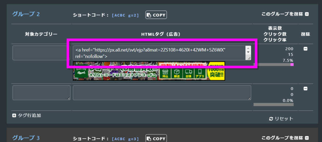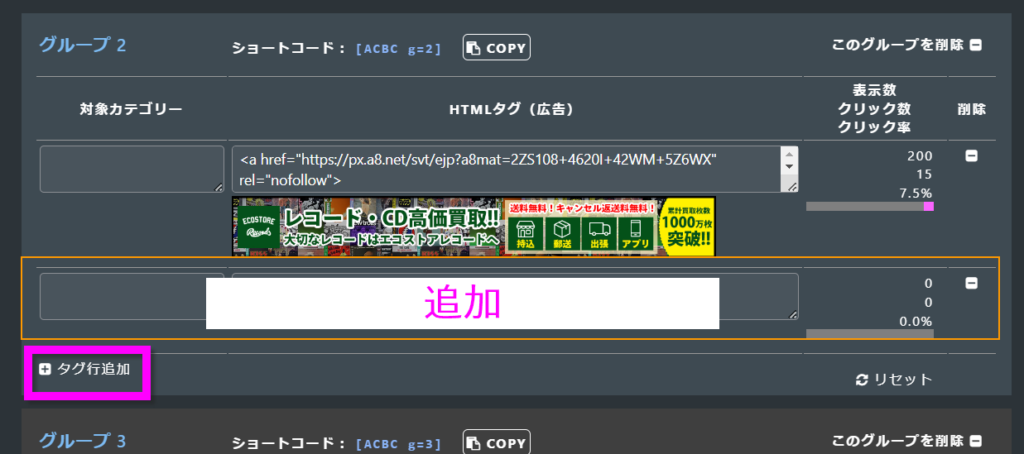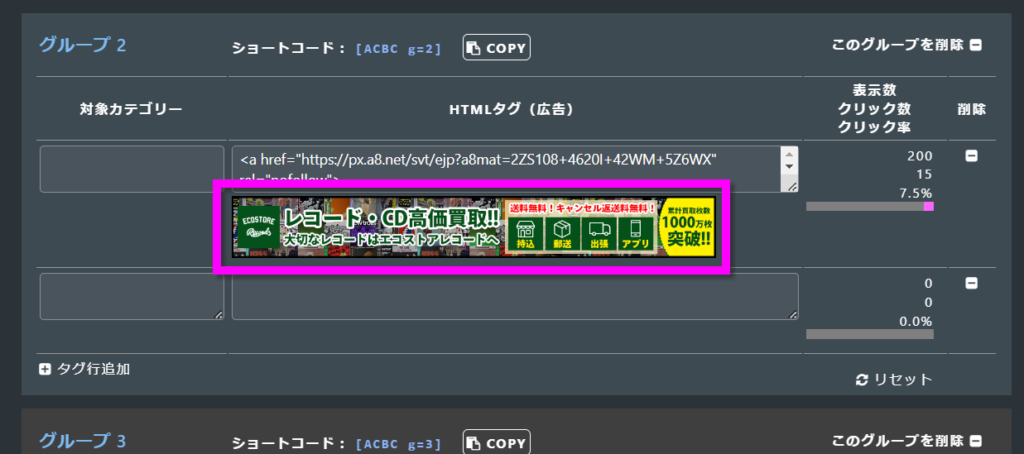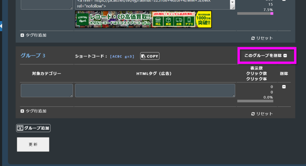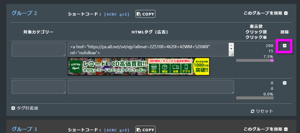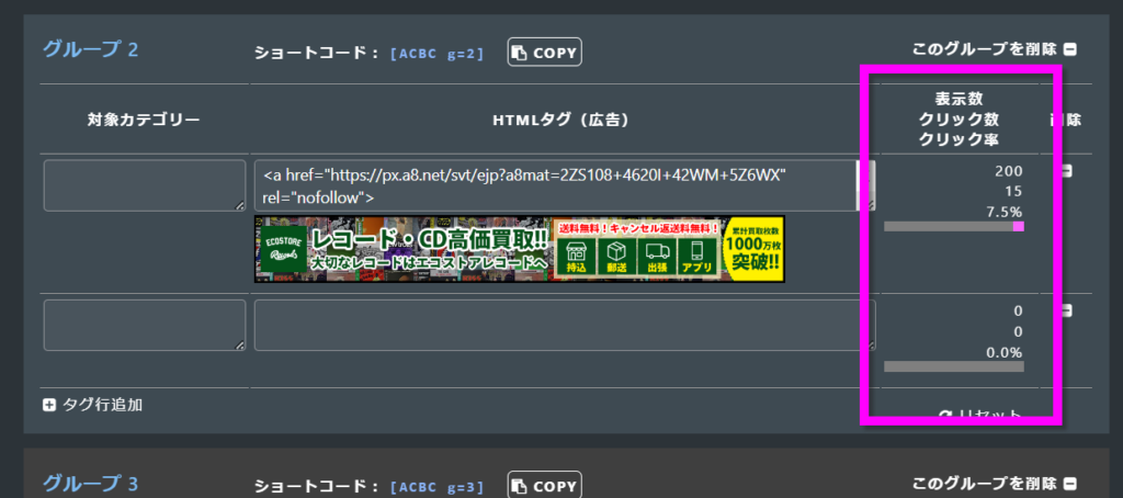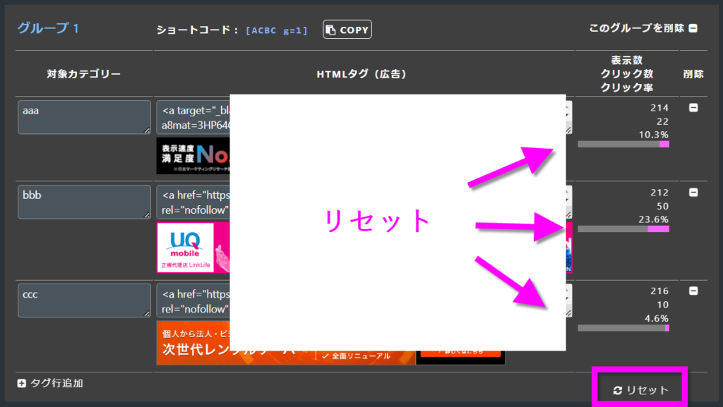 そのグループの、表示数・クリック数・クリック率をリセットします。