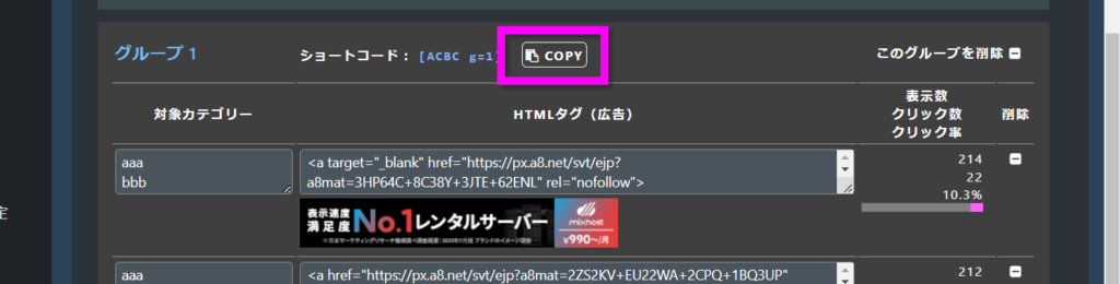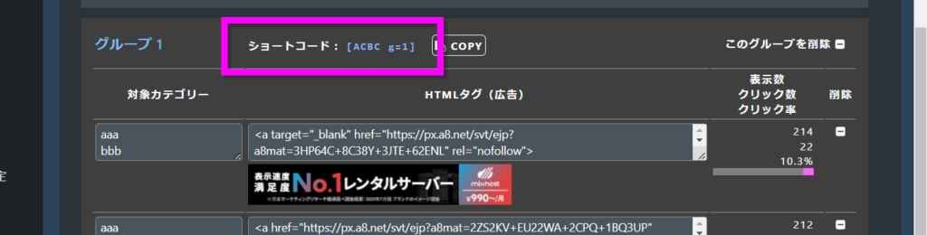 グループごとにショートコードが発行されますので、ウィジェットや記事に記載してください。