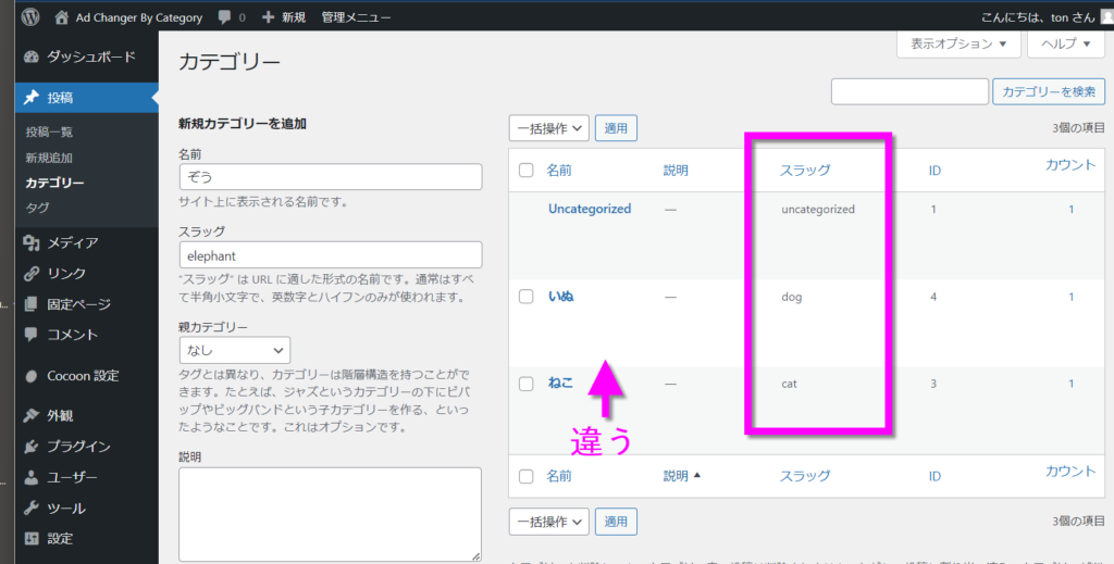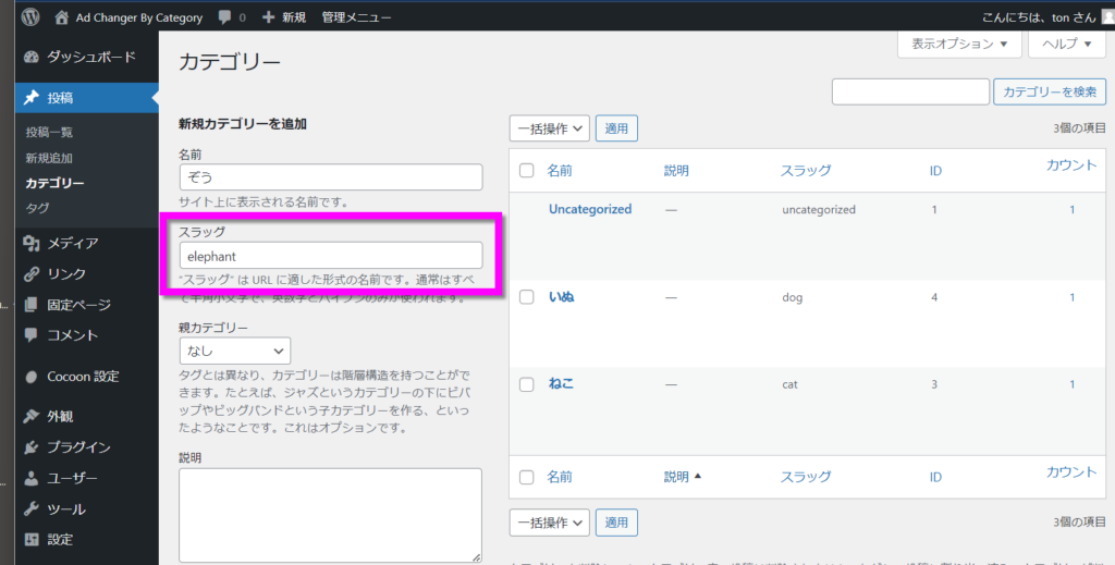 スラッグは新規カテゴリーを登録する際にここで指定します。