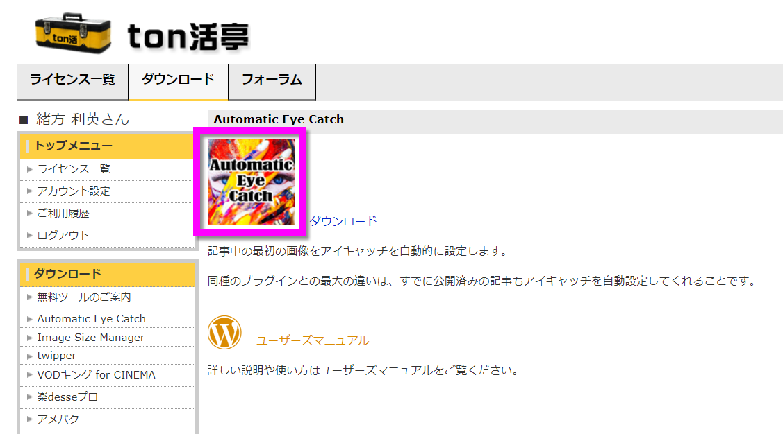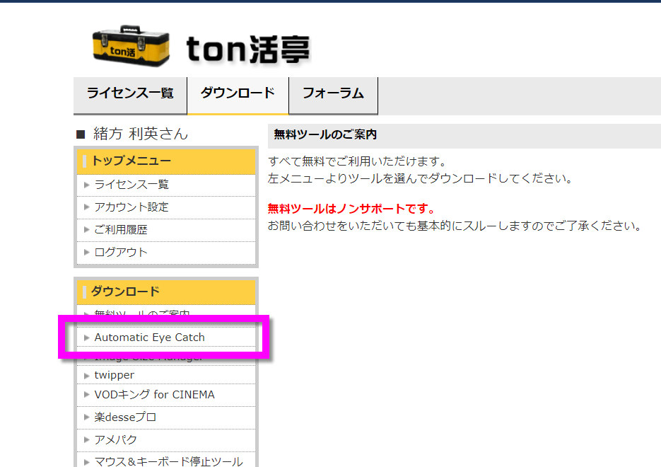 会員サイトにログインし、ライセンス一覧より「無料ツール」を選択します。