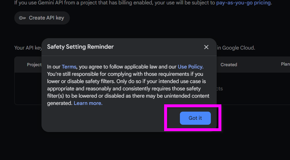 Gemini APIの画面に遷移したら、APIキーを取得します。