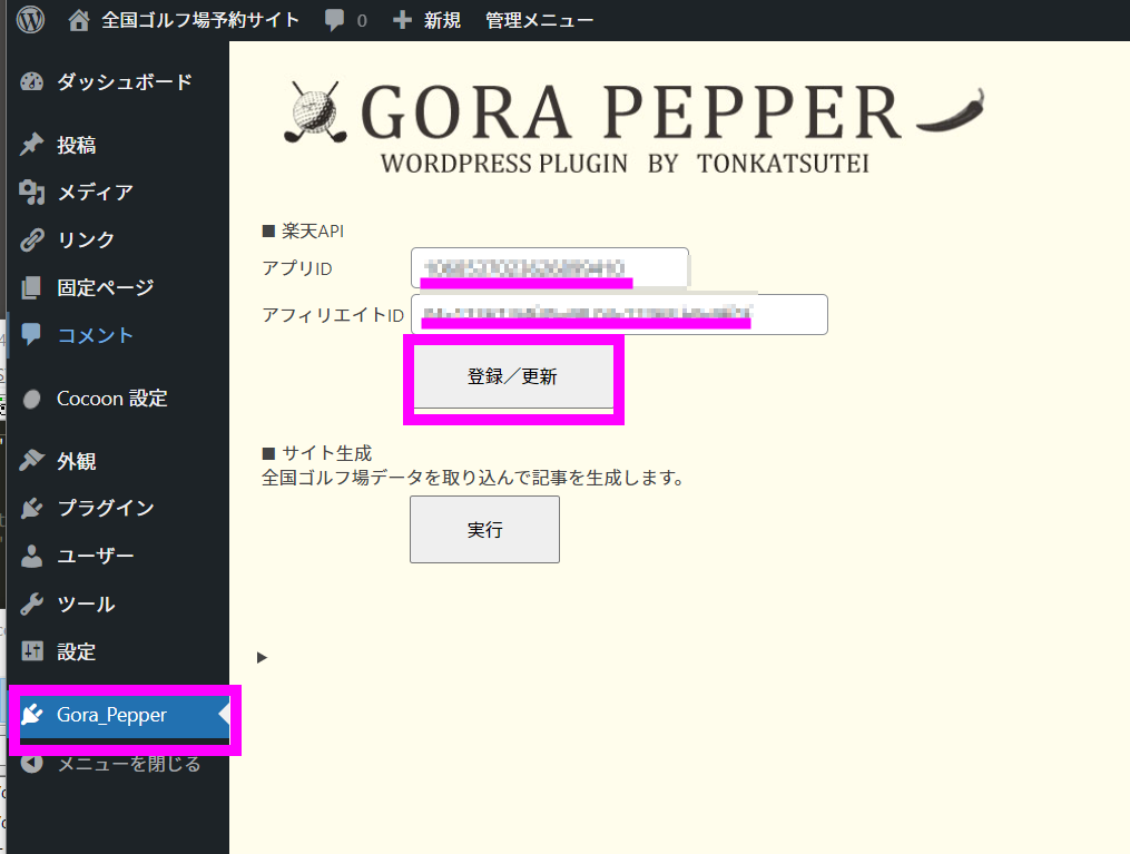 操作手順 未分類 2022.01.212022.01.22 目次 インストール楽天APIの設定サイト生成 インストール WPのダッシュボードで、プラグインの新規追加後に有効化してください。 楽天APIの設定 前ページで取得した内容を登録してください。 サイト生成 実行ボタンを押すと、サイト生成が始まります。 一旦真っ白になりますが、しばらくお待ちください。 完了しました。 途中でタイムアウトした場合は再実行してください。 完全に終了すると、2,500強のページが生成されます。投稿一覧で確認して少ない時も再実行してください。