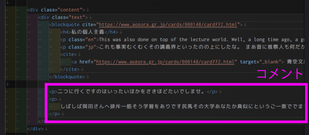 引用文が日本語の際は、<p class=”en”>・・・</p>を削除、