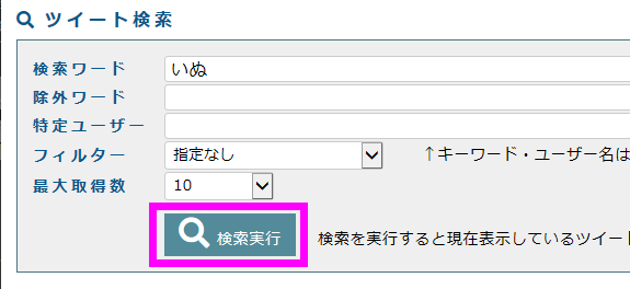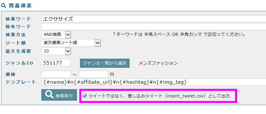 その際、「差し込みツイートとして出力」にチェックをつけて検索実行を押してください。
