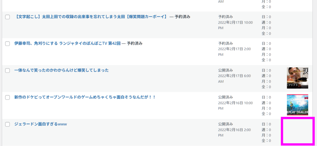 予約中の記事にはまだアイキャッチが表示されていませんが、公開されていくとアイキャッチがセットされていきます。