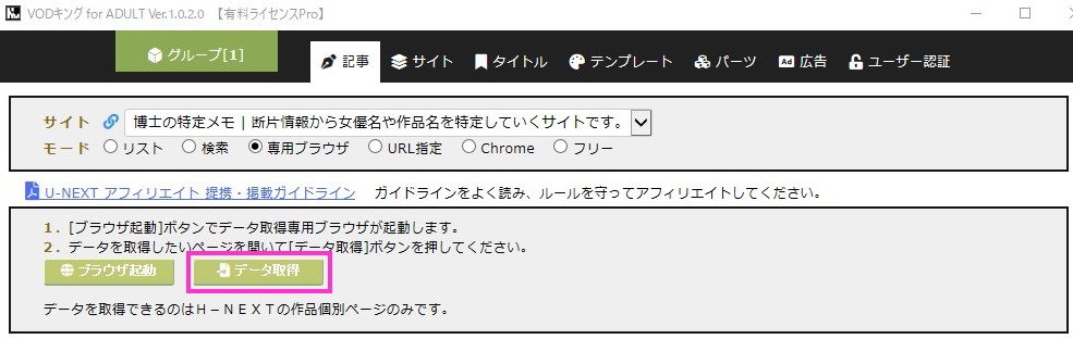 リストモードや検索モードでは探せない作品も、この専⽤ブラウザモードを使えばデータを取得できます。