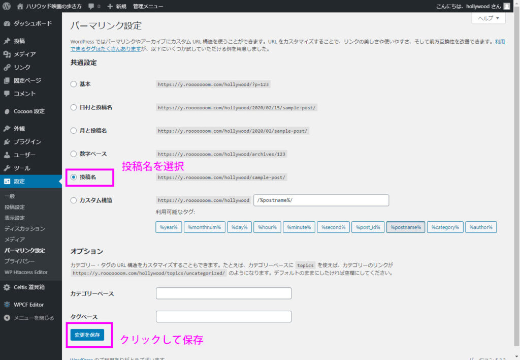 パーマリンク VODキングシリーズ(CINEMA , BOOK , ADULT)では、多くの画面を共通化していますので、一部で他シリーズの画面を流用していることもあります。 また、説明をする上で問題が無い場合は、旧バージョンの画面のままになっている場合もありますが、ご了承ください。 ワードプレスの設定 2020.09.222022.03.11 必ずパーマリンクの設定をしてください。 目次 設定する理由設定 設定する理由 1 作品番号を付ける VODキング for ADULTでは、作品番号を投稿名(スラッグ)として投稿しています。 それを有効活用できるようにするために、パーマリンクとして設定します。 2 .htaccessを作る あとで .htaccessの編集が必要になるのですが、 WPをインストールしただけでは、.htaccessが生成されていないので編集できません。 パーマリンクを設定することで、.htaccessが生成されます。 設定