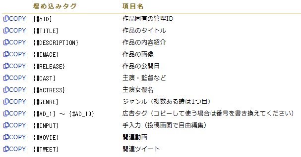 タイトル VODキングシリーズ(CINEMA , BOOK , ADULT)では、多くの画面を共通化していますので、一部で他シリーズの画面を流用していることもあります。 また、説明をする上で問題が無い場合は、旧バージョンの画面のままになっている場合もありますが、ご了承ください。 操作マニュアル 2020.10.142022.03.11 投稿記事のタイトルです。 サイトのタイトルではありませんので、 間違えないでください。 目次 埋め込みタグ追加 埋め込みタグ 初期値として12パターンセットしているので察しが付くと思いますが、埋め込みタグが使⽤可能です。 ただしタイトル内ではすべてのタグが使えるわけではありません。{#AID}、{#ACTRESS}、{#GENRE}、{#TITLE}のみ使⽤できます。 埋め込みタグの詳細は、パーツの項を参照してください。 追加 理論的には無制限に追加できますが、ツールの動作パフォーマンスが落ちる可能性があります。
